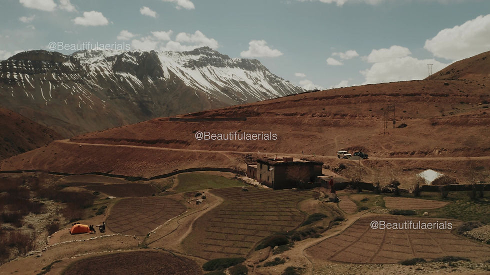 Aerial view of daily life in small Kakti village, Spiti Valley, India